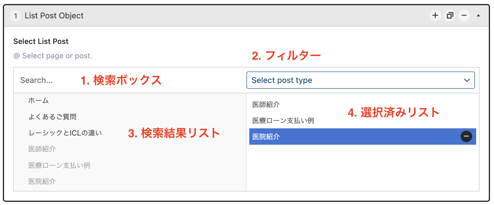作成済みのページや記事の名前を入力して検索できます。 - 2.フィルター: