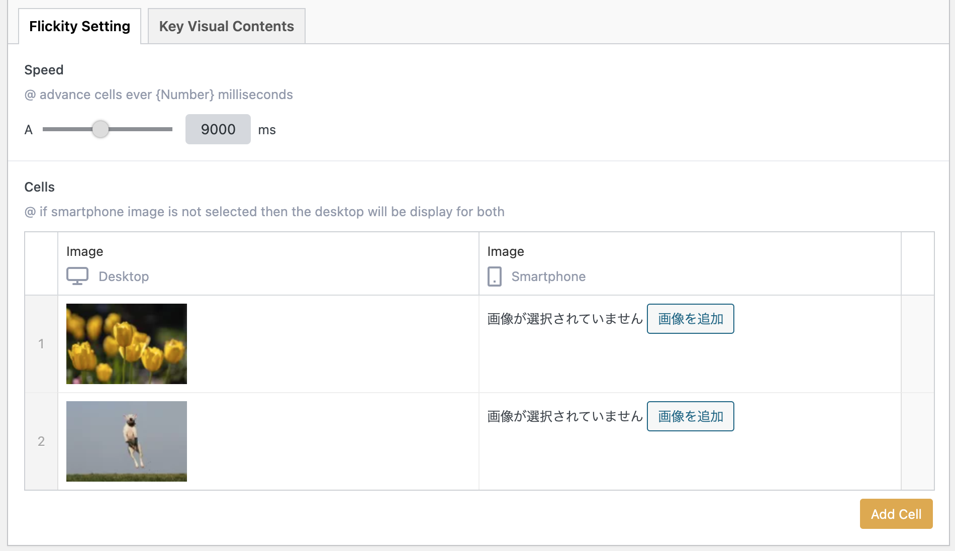 cells:表示される画像を追加または削除することができます。各セルにはdesktopとsmartphoneの2つの部分があります。この部分で選択された画像は、それぞれの対応するデバイスで表示されます。また、画像は位置を交換することができます。