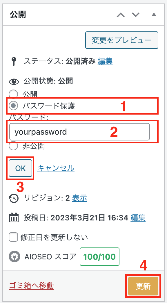 注意: 一度パスワードを入力した場合、次回以降はそのページや投稿に対して再びパスワードを入力する必要はありません。