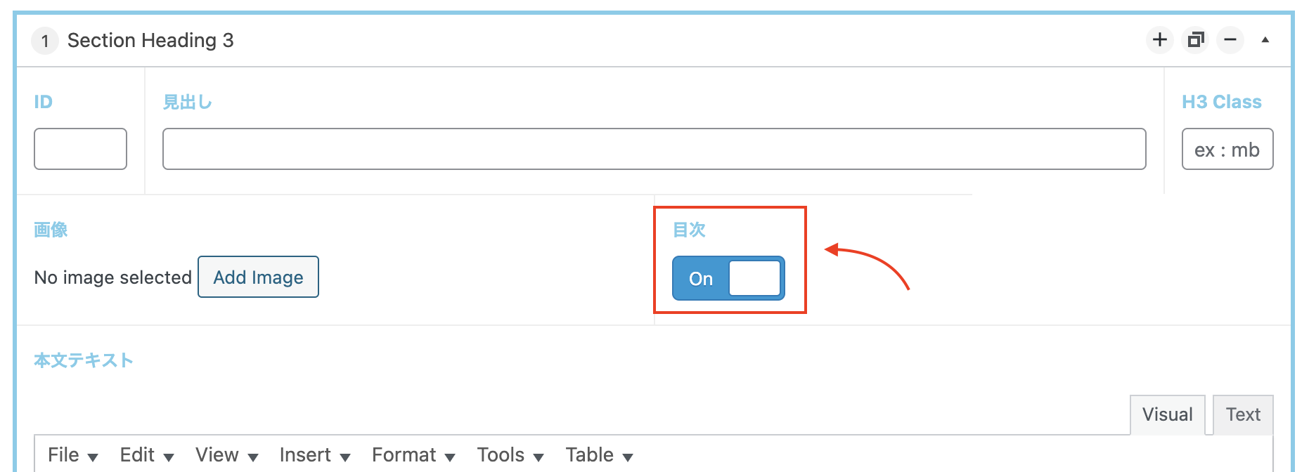 目次は[H3]見出しの下に配置され、[h4]、[h5]見出しを含みます。